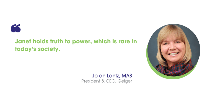 All the while, Lantz adds, she became a mentor, sponsor and leader to others outside of Geiger. “What Janet won’t say is how much courage it took for her to step out of her comfort zone time after time for her own personal achievements, as well as to assist others to reach their goals,” she says. “Janet is strong, courageous, ethical, kind, knowledgeable, warm, friendly and has the unique ability to stand up for what is right. Janet holds truth to power, which is rare in today’s society.”