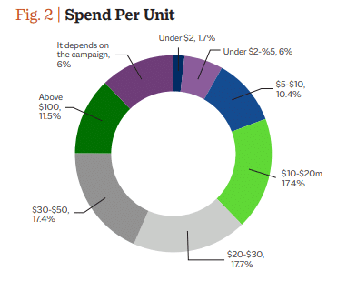 Between $10-$50 per unit are nearly even clusters of budgets broken down as follows: