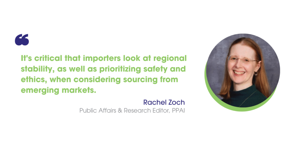 Bangladesh emerged as one of the fastest-growing alternatives to China, especially for apparel, after the tariffs rolled out in 2018, according to Rachel Zoch, public affairs and research editor at PPAI.