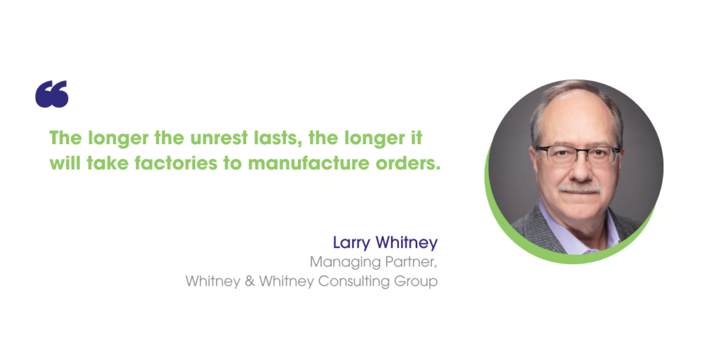 The unrest may lead to delays in promotional products firms receiving apparel in time for the holiday season, says Larry Whitney, managing partner of Whitney & Whitney Consulting Group and former director of global compliance at PCNA – the No. 3 supplier in the PPAI 100.