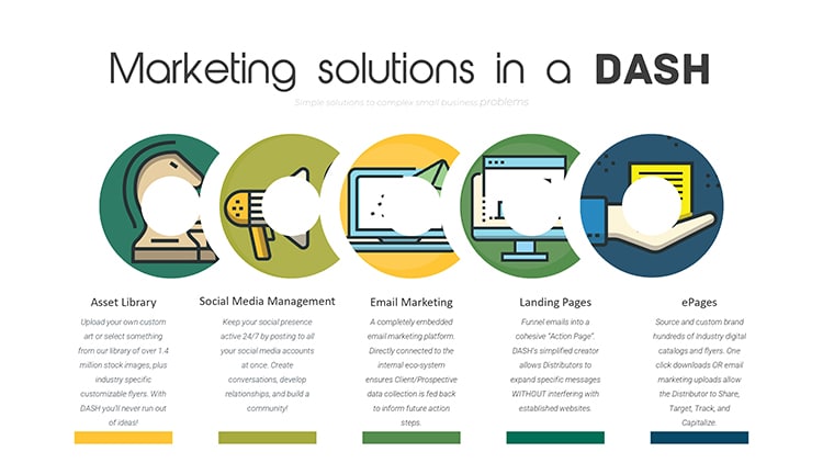 DASH is designed to bring a simple, cost-effective marketing platform to the promotional products industry, with the following tools as part of its core set: email marketing, social media marketing, design tools, digital catalogs and statistics.