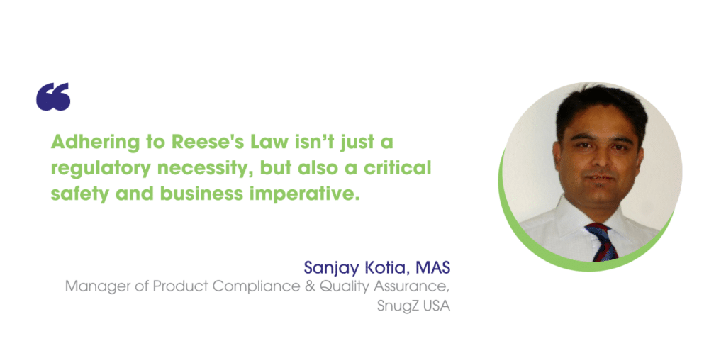 “The mandatory standard requirements consistent with Reese’s Law help companies in the consumer product landscape, especially in the promotional products industry, to mitigate legal risks and avoid potential liability,” says Sanjay Kotia, MAS, manager of product compliance and quality assurance at SnugZ USA – the No. 7 supplier in the PPAI 100. “Non-compliance could lead to recalls, lawsuits or damage to the organization’s brand reputation.”