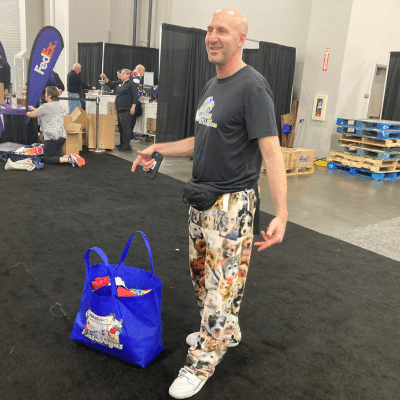 A 28-year veteran of the promo industry, Keith Wilson, self-described “promogenie” of Public Identity, powered by BAMKO (PPAI 242148, D11) – ranked the No. 4 distributor in the inaugural PPAI 100 – stood out in the sea of eager attendees with his custom dog photo-collaged pants of his pet Bucky and all his furry friends.