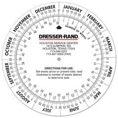 This large date 2-wheel calculator is perfect for end users working in manufacturing, contracting, architecture and engineering, or anyone who needs to look ahead. For example, this is a perfect choice for skydivers who need to remember to repack parachutes every three months. To use, line up the arrow to today’s date and look weeks ahead. Also available in a standard size, imprint space is available on the front and back of the larger wheel, as well as indicators for weeks and days.