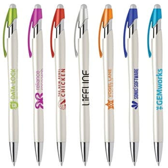 Perfect for sunny summer days, the La Jolla Pearl with Stylus has a pearlized metallic painted barrel with pops of color on the clip. While the pen glides away, the trendy satin silver stylus will also keep fingers away from public screens. Clients can customize the white pearlized barrel by selecting a clip color and decor with a full-color inkjet imprint using ColorJet technology.
