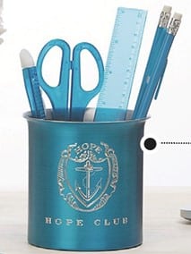 For clients welcoming their employees back into the office, think ahead with this aluminum pen and pencil holder. This common office desk staple can brighten recipients’ day with a personal or inspirational message. Available in nine bright colors: red, green, gold, purple, orange, lime, black, silver and blue (shown).