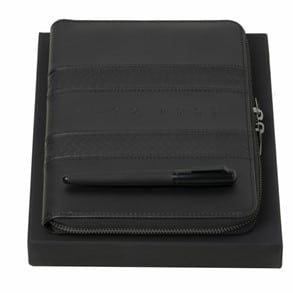 For conferences and meetings, this classic black Hugo Boss Set Tire Pen and A5 folder will complete any corporate gift. This set is adorned with a sports car-inspired print, mixing contemporary minimalism with a rustic aesthetic. The dark chrome plating gives this pen an air of urban sophistication, while the impeccably balanced silhouette and well-engineered technical features allow for an optimal writing experience.