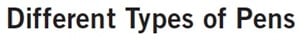 - Ballpoint pens are the most common and well-known type of pen. These pens use oil-based ink that dries faster than other types of ink, which mean less smudging. This ink is also thicker, so they use less ink when writing and are longer-lasting. However, thicker ink is also more prone to clumping, and for a smooth finish, more pressure must be applied when writing. Ballpoint pens are an easy and reliable option for simple, everyday use.
