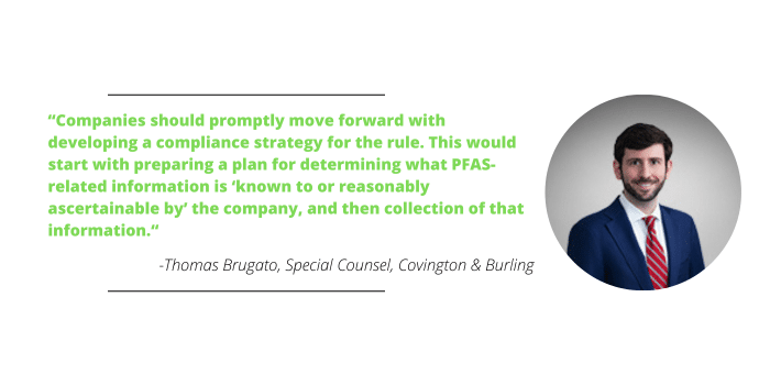 “Companies should promptly move forward with developing a compliance strategy for the rule,” Brugato says. “This would start with preparing a plan for determining what PFAS-related information is ‘known to or reasonably ascertainable by’ the company, and then collection of that information.”