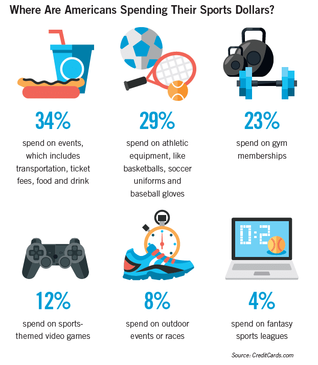 Statistically, fans aren’t shy about their spending when it comes to supporting their teams. CNBC reported that in 2017, consumers spent $56 billion to attend sporting events, with 34 percent of American adults spending, on average, $710 per person. An additional 12 percent of Americans spent an average of $273 on sports-themed video games ($8 billion in total sales), followed by eight percent who spent $254 on race entry fees ($4.8 billion in total sales) and four percent who spent $251 to partake in fantasy sports leagues ($2.3 billion in total). The sports industry reach even extends to gym membership purchases and marathon entries, according to CreditCards.com. A national survey of 1,003 American adults showed that 23 percent of sports-related consumer spending is put toward gym memberships, while eight percent is to partake in outdoor events, like a 5K run or obstacle course-style race.