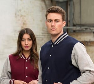 This unisex Just Hoods Letterman Jacket can celebrate today’s teams with a vintage look. This 100 percent cotton face jacket includes a contrasting sleeve and pocket, along with a striped collar, cuffs and waistband, emphasizing an old-school feel. Press-stud closure buttons add to the classic look, while hidden earphone loops offer modern convenience. Available in S-3XL in 13 colors, shown here in burgundy/heather gray and oxford navy/heather gray.