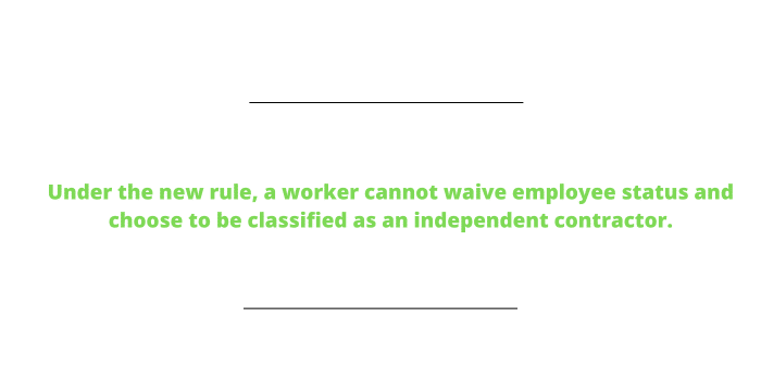 Notably, under the new rule, a worker cannot waive employee status and choose to be classified as an independent contractor. The Department of Labor states, “The Supreme Court has explained that permitting employees to waive FLSA rights would harm other employees and undermine the Act’s goal of eliminating unfair methods of competition in commerce.”