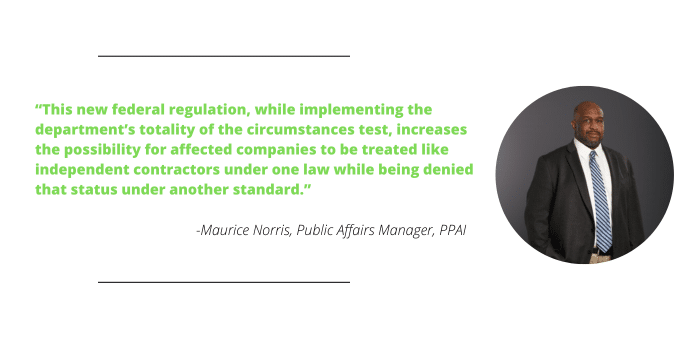 “This decision creates inherent confusion,” Maurice Norris, PPAI’s public affairs manager says. “There are at least four federal laws and two federal regulations that define independent contractors, and several states have their own criteria. This new federal regulation, while implementing the department’s totality of the circumstances test, increases the possibility for affected companies to be treated like independent contractors under one law while being denied that status under another standard.”