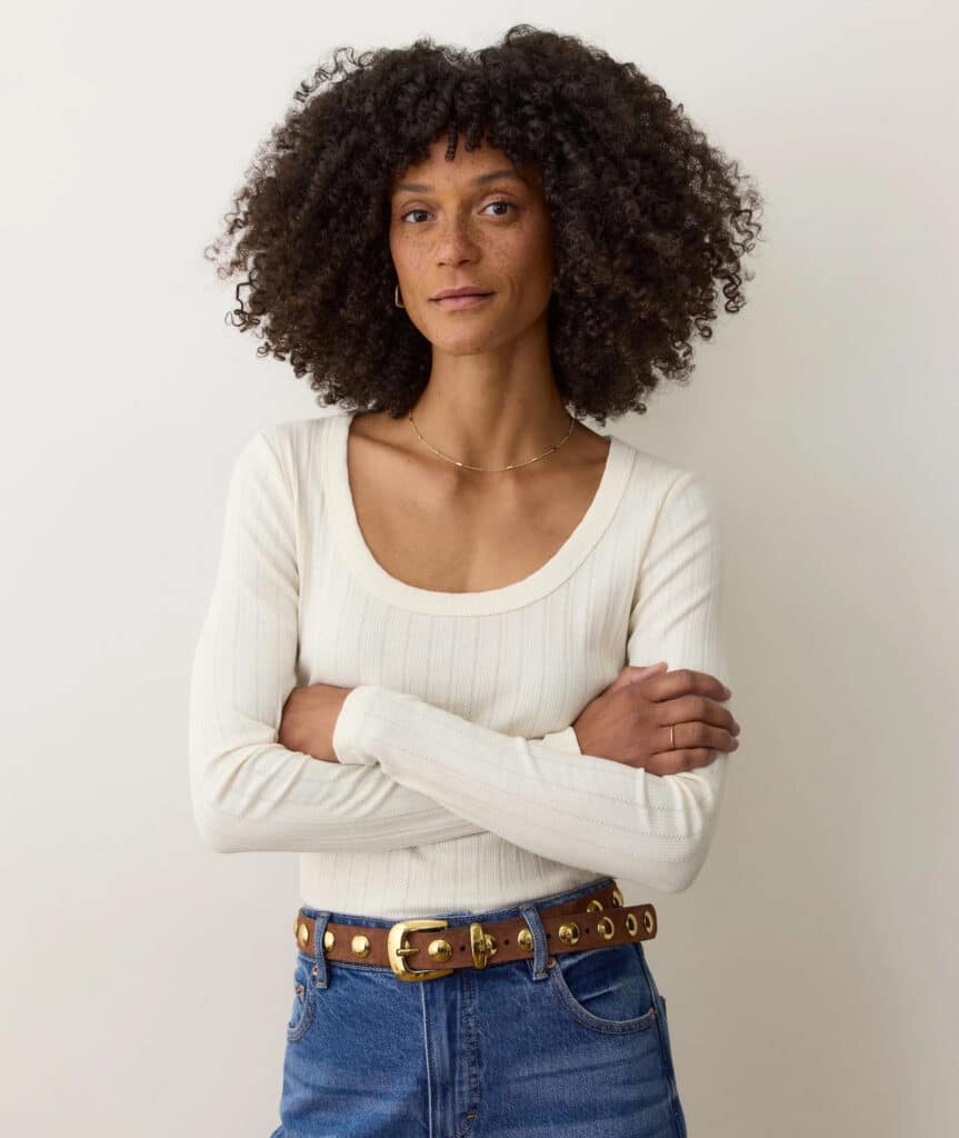 The Lexi Rib Pointelle Longsleeve Scoop Tee is a great choice for both Gen Z and millennials. It’s made responsibly and comes in navy and antique white. The scoop neckline and pointelle detailing add an elegant touch to this versatile basic shirt. The pointelle pattern has a Y2K feel that Gen Z will love, and the sleek silhouette will win over millennials.