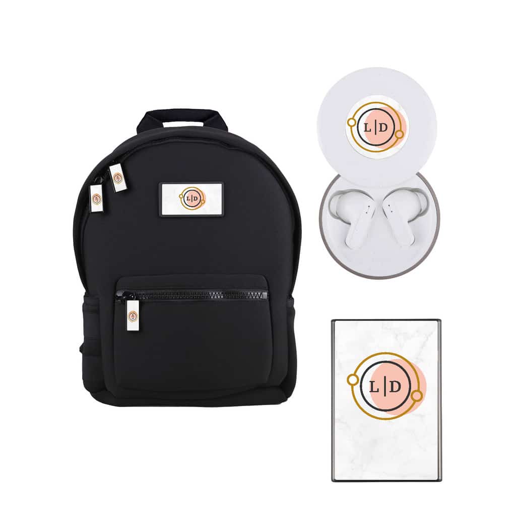 This Trendsetter Kit is perfect for the on-the-go Gen Z worker. This kit includes the Soho Elizabeth Small Backpack, the Slim Wireless Power Bank and Chromeo Wireless Earbuds and Wireless Charger. These items all come standard with full-color personalization. Customize the items with a creative and trendy graphic or simple logo to appeal to Gen Z. The backpack comes in a black/gray color, and the portable charger is black.