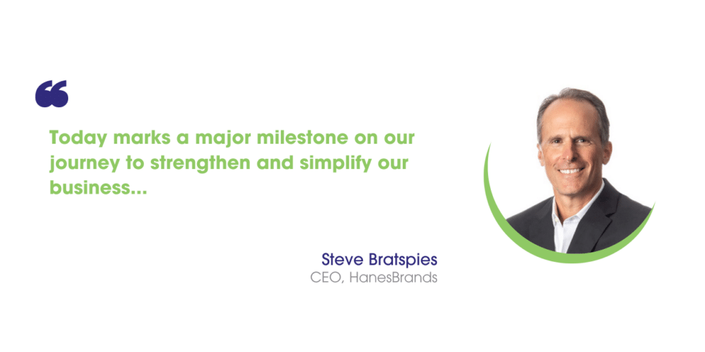 “Today marks a major milestone on our journey to strengthen and simplify our business and is the culmination of a significant team effort to position HanesBrands on the optimal path for the future,” says HanesBrands CEO Steve Bratspies. “With the successful completion of this transaction, combined with our internal cash generation, we expect to pay down approximately $1 billion of debt in the second half of 2024.