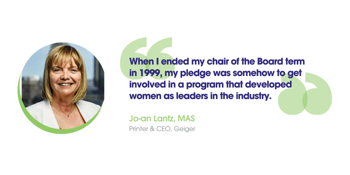 Jo-an Lantz, MAS, president and CEO, Geiger, 2014 PPAI Woman of Achievement recipient and 2009 inductee into the PPAI Hall of Fame: When I ended my chair of the Board term in 1999, my pledge to the Board was somehow to get involved in a program that developed women as leaders in the industry.