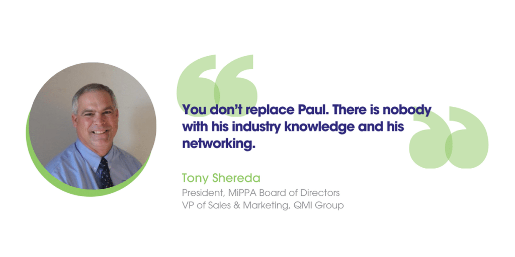 “You don’t replace Paul,” Shereda says. “You find a new executive director. There is nobody with his industry knowledge and his networking and his ability to pick up the phone and call the CEO of PCNA or Gemline.”
