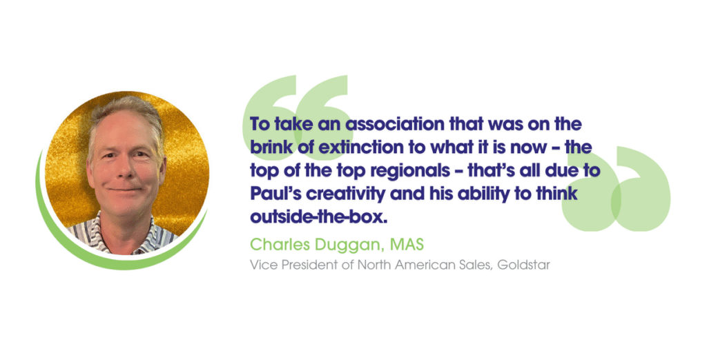 “To take an association that was on the brink of extinction to what it is now – the top of the top regionals – that’s all due to Paul’s creativity and his ability to think outside-the-box and execute those ideas,” says Charles Duggan, MAS, vice president of North American sales at Goldstar – the No. 16 supplier in the PPAI 100.