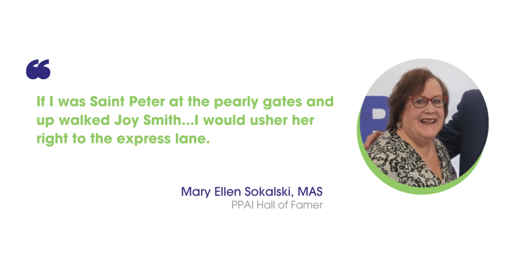 Countering that nonchalant humility is the praise heaped on her by others in the industry, including Mary Ellen Sokalski, MAS, who was inducted into the 2023 PPAI Hall of Fame.