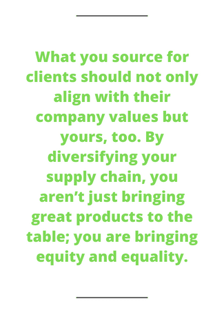 Regarding the social arm of ESG, I believe that supplier diversity is an integral, non-negotiable component. What you source for clients should not only align with their company values but yours, too. By diversifying your supply chain, you aren’t just bringing great products to the table; you are bringing equity and equality.