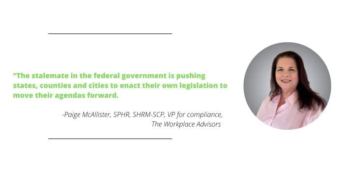 Pay transparency and equity: Several cities and states have enacted laws intended to bring equity to pay practices. These laws include: