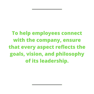 Organizational Culture: To help employees connect with the company, ensure that every aspect reflects the goals, vision, and philosophy of its leadership. Policies, practices, communication, decisions and clients all need to connect back to the same message so employees know who the company is and can gauge their actions accordingly. Stating one thing but letting managers and employees do something different sends mixed messages and makes employees doubt the integrity of the company they work for.