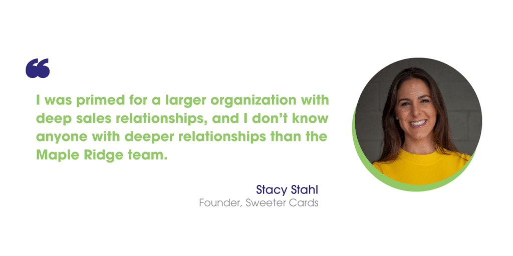 As for Stahl, she feels as if she’s taken her company as far as she can on her own. Joining an established player in the food market can instantly broaden Sweeter Cards’ reach. After all, Maple Ridge Farms has relationships with nearly seven times as many distributors as Stahl’s firm does.
