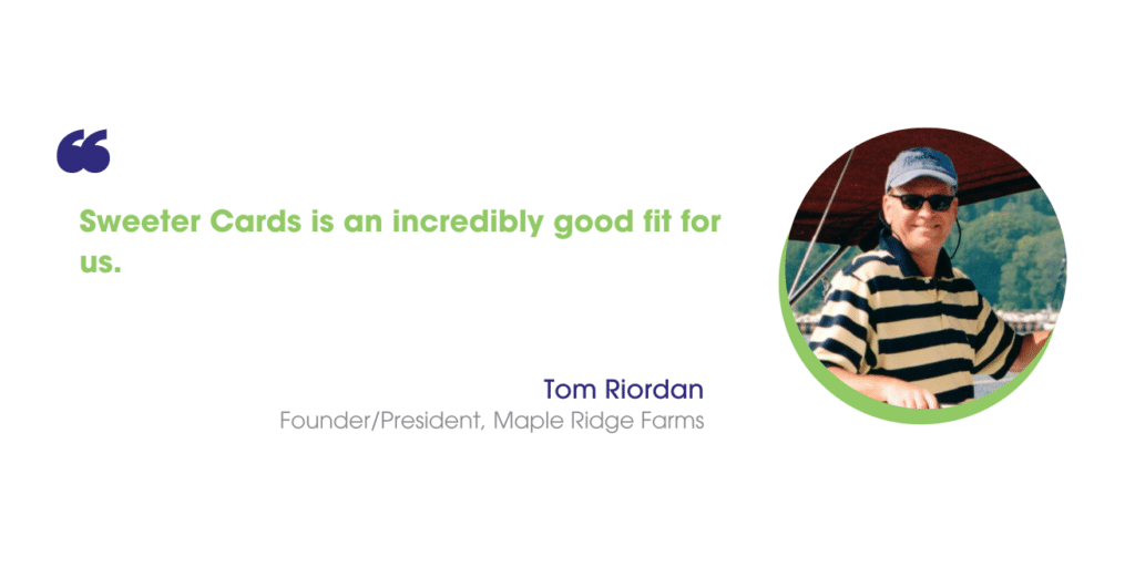 “Sweeter Cards is an incredibly good fit for us,” says Tom Riordan, founder and president of Maple Ridge Farms. “The enthusiasm and synergy between these two companies is incredible.”