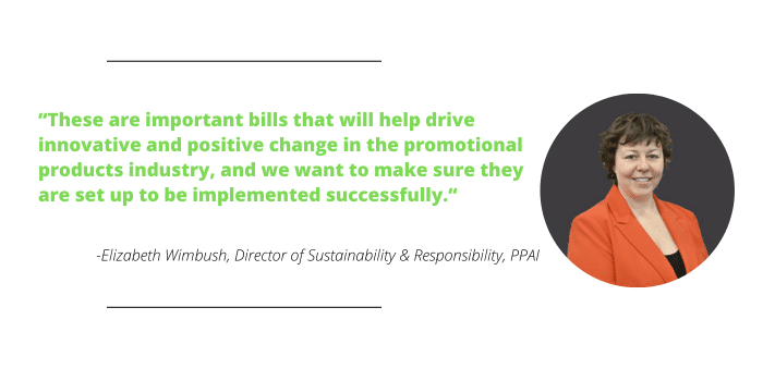 “These are important bills that will help drive innovative and positive change in the promotional products industry, and we want to make sure they are set up to be implemented successfully,” says Elizabeth Wimbush, PPAI’s director of sustainability & responsibility.
