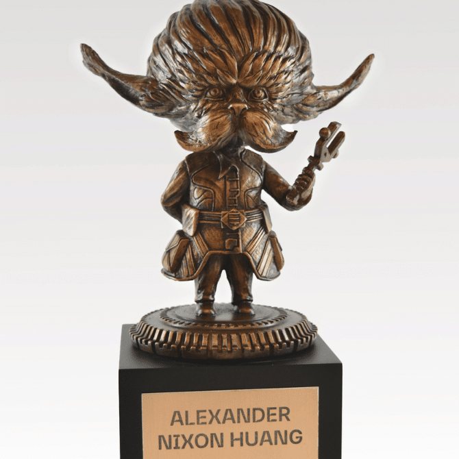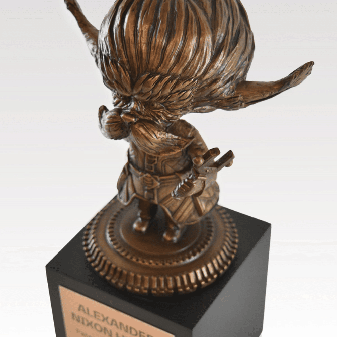 When your client is a video game developer that wants to recognize employees who have contributed innovations that result in patent approval, you probably have some space for creativity. Visions worked with Riot to bring to life one of the characters from its League of Legends game. The figure’s mold was hand-carved before being cast and hand-painted to give it an antique look. The wood base it stands on allows for personalization of each award.
