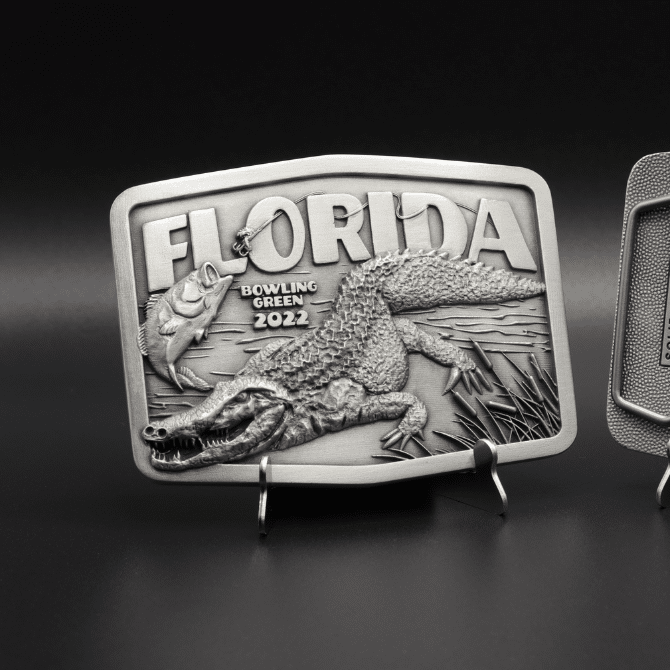 Designed to commemorate the ProAssurance Leadership Conference in Bowling Green, Florida, this campaign provided attendees with something they could hold on to as a keepsake or wear when they want to stand out. The pewter buckle features a vividly detailed alligator, right down to its teeth and scales. Add the fish biting the line that weaves through the text, and it’s like a memory in your hand. Rightfully so – the design is a dramatic interpretation of a vintage travel postcard, only this version has the literal feel of Indiana Metal Craft’s handiwork.