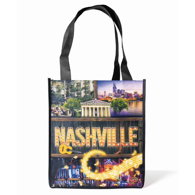 Created for Promo Marketing’s 2023 Power Meetings, BAG MAKERS came up with a Renoir PET Non-Woven event tote with artwork featuring famous Nashville landmarks. To add an eye-catching touch, sparkle imprinting was superimposed over parts of the sublimated artwork, as well as silver holographic dots specifically placed over the lights of the Nashville sign depicted in the center, creating a multi-dimensional effect. The sublimation imprint on the back featured meeting locations, dates and company logos.