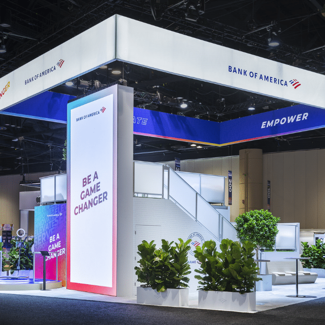 Bank of America wanted to accomplish a lot with its booth for the Grace Hopper Celebration of Women in Computing conference, an event focused on the advancement of the careers of women and nonbinary people in computing and technology. To maximize the space, Orbus Visual Communications – in collaboration with Exhibit Control – produced a multi-level booth that totaled 40 x 50 feet. The top floor was a recruiting space for Girls Who Code. Bank of America executives met with career seekers on the middle level, and the lower level included high-tech blue glow and motion tracking to create a galactic effect for giveaways. Above it all, a hanging lightbox projected the Bank of America brand across the show floor.