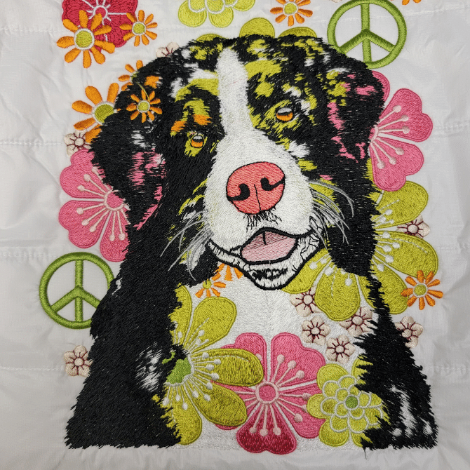 If you want to trigger emotion in people, reminding them of their pets is always a safe bet. Easier said than done, however – the depiction has to be realistic, and with embroidery that realism takes a lot of craft work. Vantage Apparel’s embroidery of a Bernese mountain dog was designed to be so accurate recipients would want to hug it. Florentine stitching and liquid effects were used to replicate the definition of the image, and random stitch effects give an accurate rendition of fur. Strategic use of small amounts of white thread give the dog’s coat a shiny, healthy appearance.