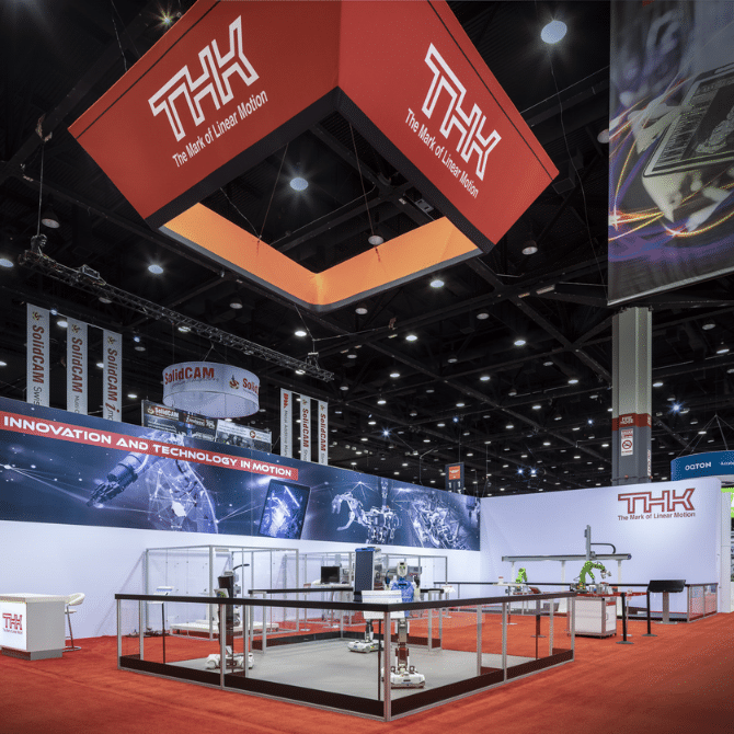 Working for GES client THK, Orbus Visual Communications created a booth themed around “Innovation and Technology in Motion.” THK is known for linear motion guide mechanisms, so a custom booth was needed with both the space and versatility to showcase those offerings. Included was an L-shaped backwall that was 102 feet wide and provided structure to the booth. Orbus Panoptic Eclipse Blockout fabric prevented shadowing or light from blemishing the white backwall.
