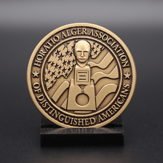 With crisp and refined detail, Indiana Metal Craft created a 2-inch brass coin to be presented as a gift to members of the Horatio Alger Association. The coin, designed for insertion in a leather luggage tag, was minted with a bust of Horatio Alger on a waving flag as the backdrop. The hand satin finish gives it the look of both a collector’s edition and an outward facing symbol of status and membership.