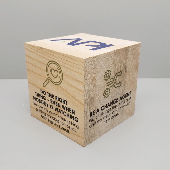Bold Promo took its client’s mission and value statements and made them tangible with custom UV-printed wooden cubes featuring a unique design and message on each side, such as “Do The Right Thing – Even When Nobody Is Watching” and “Be A Change Agent.” The cubes were given to each of the client’s employees to display on their desk or in their office.