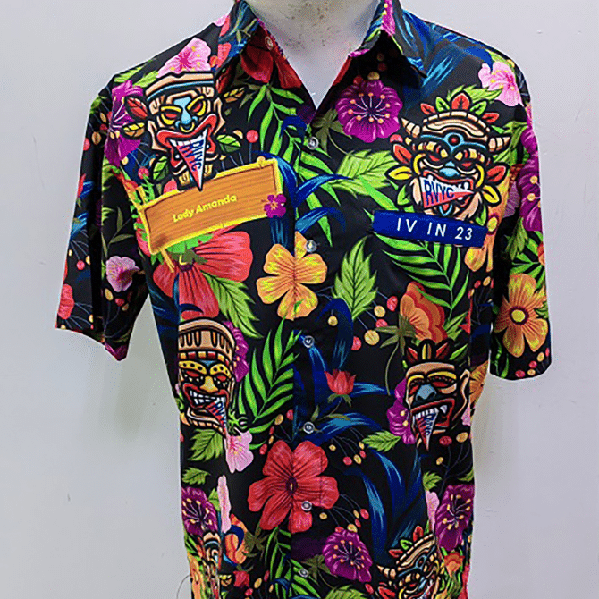 Eversole Run’s client was looking for something its 100-plus employees could wear that would make them stand out. The result was a full dye sublimated camp shirt personalized with the name of each employee. Aligning the nametag portion in the correct position on the garment and making sure each unique name fit perfectly inside the “tag” was a challenge. Getting the colors to print clearly and vibrant with no mistakes also required intricate design processes and thorough proofing before shipment.