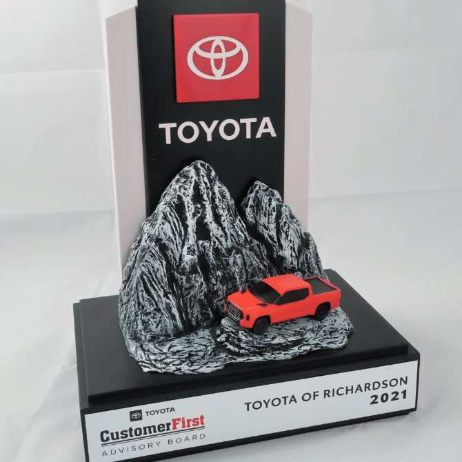 Toyota wanted an award that included its Tundra truck model navigating nature’s terrain. It took a collaboration between distributor and supplier willing to work together and share resources. Doug Fregolle Promotions sourced the CAD files, and StoneyCreek worked with a 3D print shop to create a model. Throughout the process, the award was touched by 15 different individuals across each of StoneyCreek’s departments. It was a six-week journey, but eventually the final result was 50 awards using stone materials, weighing 50 pounds each.