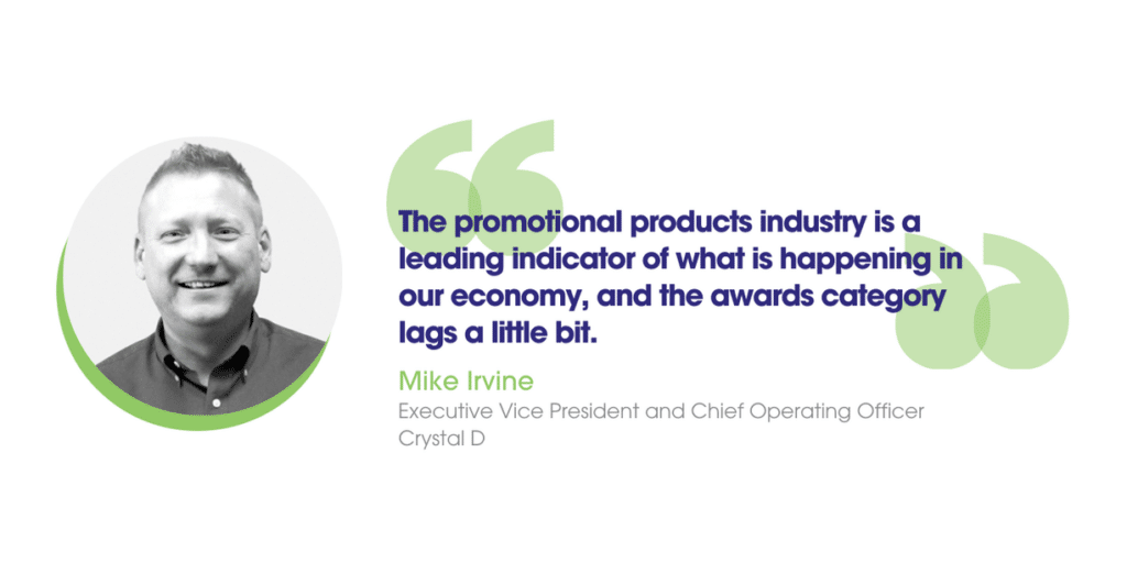 “The promotional products industry is a leading indicator of what is happening in our economy, and the awards category lags a little bit,” Irvine says. “Selling awards can be a huge advantage to a distributor looking to diversify and have stability in their revenue streams.”