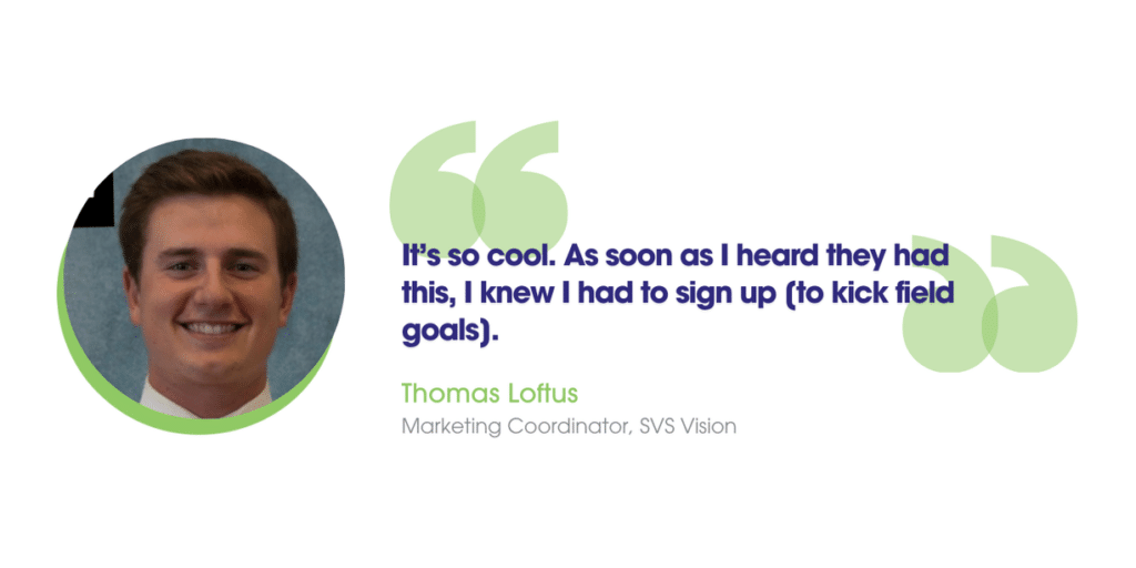 “It’s so cool,” says Loftus, a marketing coordinator for SVS Vision, which was hosted at the event by QMI Group. “As soon as I heard they had this, I knew I had to sign up, especially with Roary [the Lions’ mascot] out on the field. You can’t beat that.”