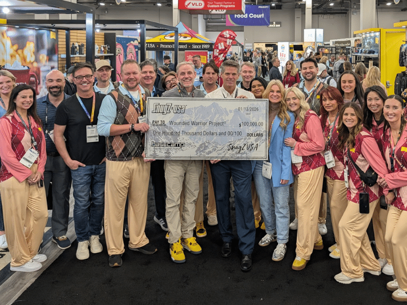 During The PPAI Expo 2026, SnugZ USA (PPAI 112982, Platinum), PPAI 100’s No. 6 supplier, presented a check to Wounded Warrior Project for a total of $100,000 to show its continued support to the veteran organization through Basecamp promotional sales.