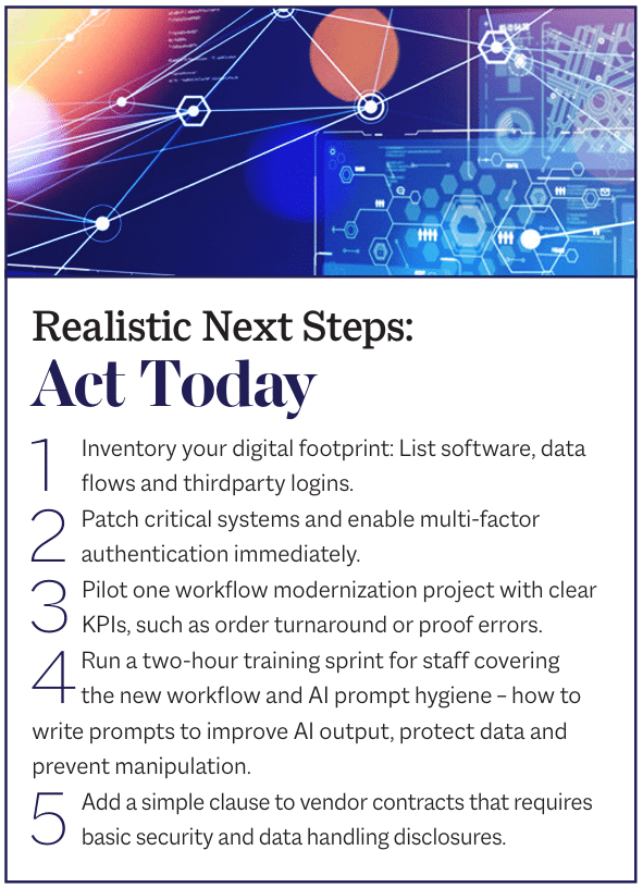 Security must be the starting point for any transformation. Begin with a simple, enforceable baseline: strong authentication, uptodate patching and encrypted backups. Treat customer lists, art files, supplier pricing and payment data as crown jewels and limit access to only those who need it. Add multifactor authentication across email, CRM and supplier portals, and schedule quarterly backups with offsite encryption to reduce ransomware exposure.