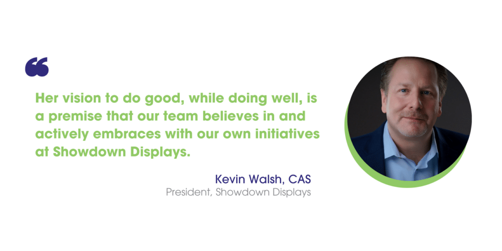 “Her vision to do good, while doing well, is a premise that our team believes in and actively embraces with our own initiatives at Showdown Displays. Increasingly, it’s a premise that our reseller partners continue to develop and promote in their markets. Kara and her team are just on the cutting edge.”