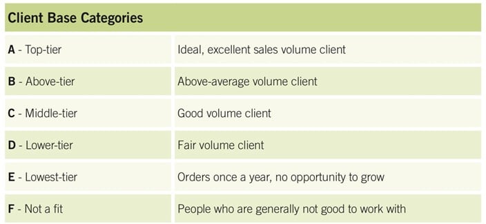 Long ago, I made a significant internal change which markedly changed my business. I separated my client list by vertical markets and classified each company into manageable channels according to the A-F categories below. There are many types of criteria; here are the ones I use: sales volume, profitability, opportunity to grow, openness of the client, communication, disposition, accounts receivable collectability, and if the client refers business to you.