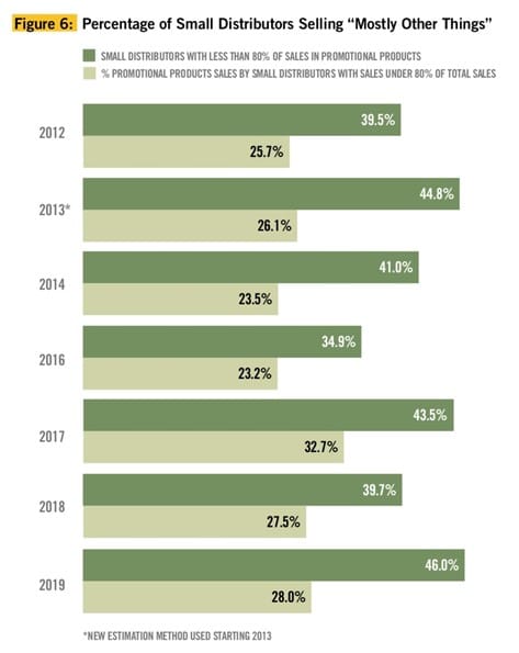 These distributors sourced 22 percent (down from 28 percent in 2018) of their revenue from promotional product sales and 78 percent from some other segment. Sales from these dual-revenue-source distributors accounted for 27.9 percent of the sales volume in the small-company segment, a slight increase from 27.5 percent in 2018.