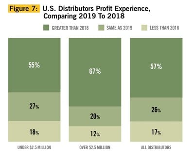 On average, the number of distributors reporting profit growth in 2019 decreased over 2018. Fewer distributors (57 percent) reported higher profits than the prior year (59 percent). Large distributors experienced the steepest decline, with 67 percent reporting higher profits in 2019 compared to 75 percent in 2018. Small distributors also saw a drop in profits in 2019 (55 percent), which is just shy of the 2018 figure (56 percent) (see Figure 7).