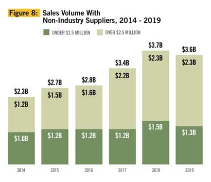 On average, the number of distributors doing business with non-industry suppliers declined in 2019. Fewer small distributors reported doing business with outside suppliers in 2019 (12.17 percent), down from 13.45 percent in 2018. The number of large distributors that reported doing business with non-industry suppliers increased in 2019, though only slightly, from 16.5 percent in 2018 to 16.99 percent (see Figure 8).