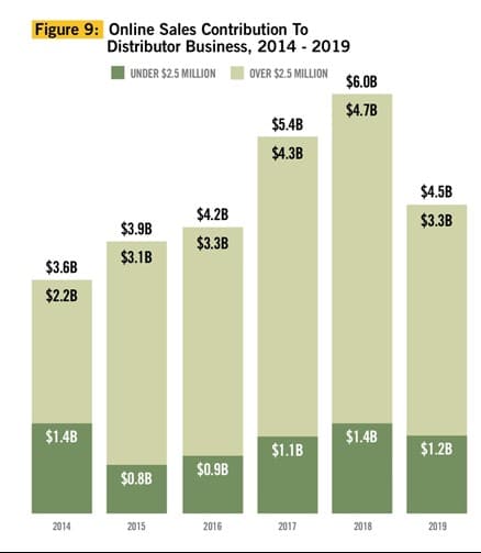 The proportion of online sales to total sales in the industry are lower for the first time since 2012, dropping from 24.3 percent in 2018 to 18.6 percent in 2019. Overall, the online sales volume decreased by 25.1 percent, which was driven by a 30-percent decline in online sales for large distributors, and an 8.3-percent decline for small distributors. Large distributors reported the harshest decline in online sales, from 33.83 percent in 2018 to 23.88 in 2019 (see Figure 9).